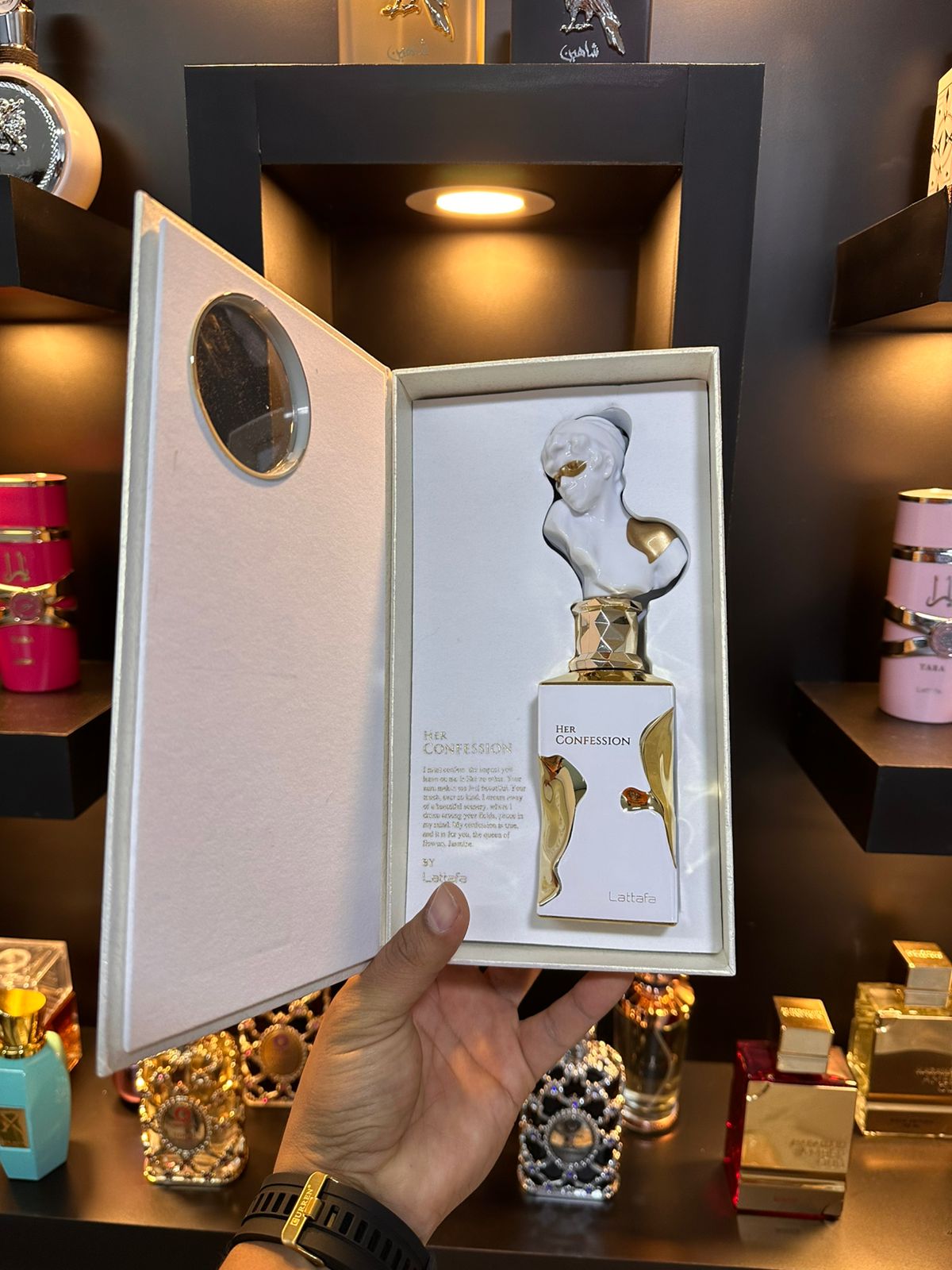 Her Confession de Lattafa Perfumes es una fragancia de la familia olfativa para Mujeres. Esta fragrancia es nueva. Her Confession se lanzó en 2024. Las Notas de Salida son Místico y canela; las Notas de Corazón son nardos, jazmín, incienso y Mahonial; las Notas de Fondo son vainilla, haba tonka y almizcle.